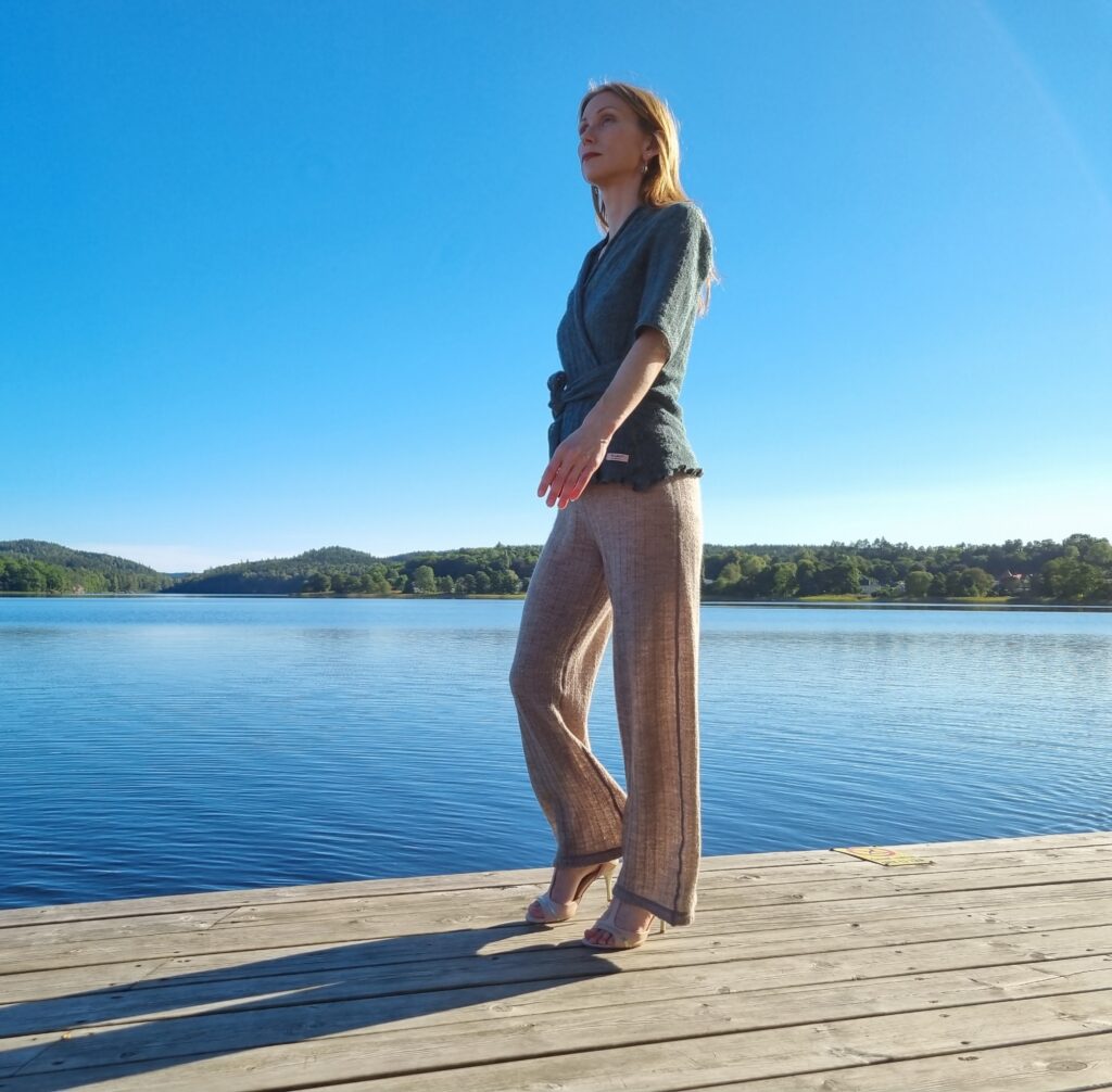 Jag jobbar mycket med stickat ulltyg som produceras i Sverige, men jobbar också gärna med linnetyger. Jag designar plagg men kan även ta personliga beställningar.